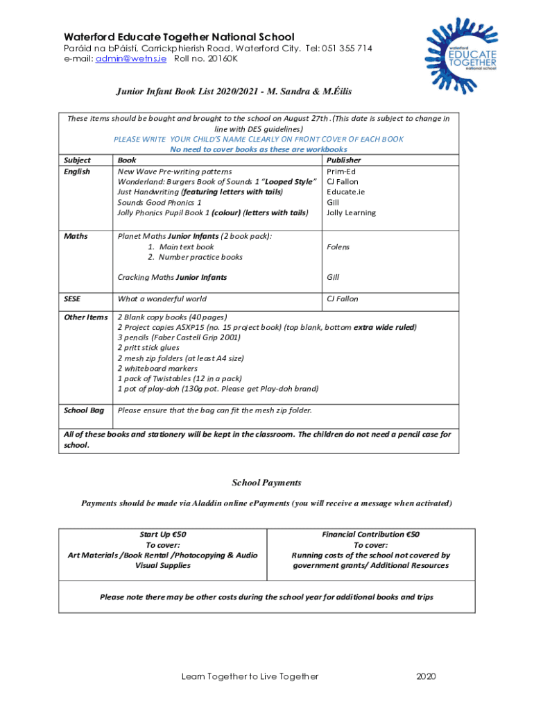 Waterford Educate Together National School Paris Na built, Carrickphierish Road, Waterford City. Tel: 051 355 714 email: admin@wetns.ie Roll no. 20160KJunior Infant Book List 2020/2021 M. Sandra &
