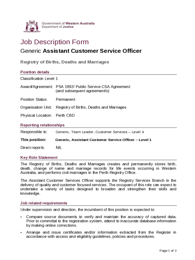Job Description Form Generic Assistant Customer Service Officer Registry of Births, Deaths and Marriages Position details Classification Level: 1 Award/Agreement: PSA 1992/ Public Service CSA Agreement