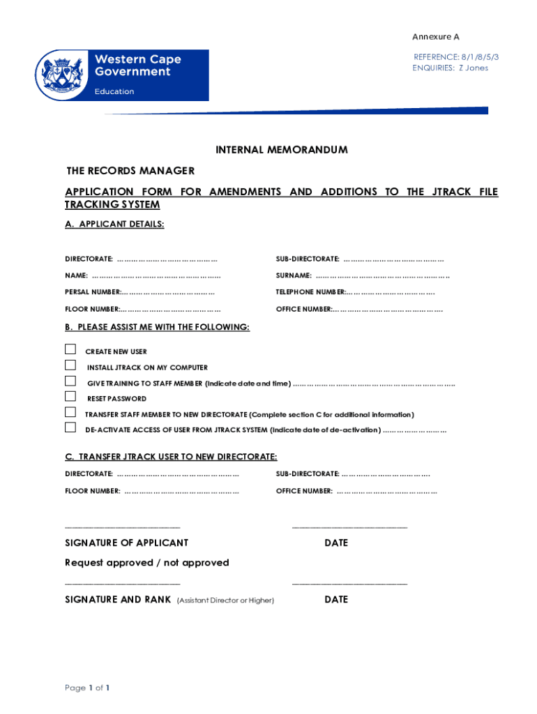 Appendix A REFERENCE: 8/1/8/5/3 Inquiries: Z JonesINTERNAL MEMORANDUM THE RECORDS MANAGER APPLICATION FORM FOR AMENDMENTS AND ADDITIONS TO THE TRACK FILE TRACKING SYSTEM A. APPLICANT DETAILS:DIRECTORATE: