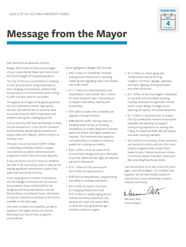 TAXES DUE:2023 CITY OF VICTORIA PROPERTY TAXESJULY4Message from the MayorTUESDAYDear Residents and Business Owners, Budget 2023 marks the first annual budget of your newly elected Mayor and Council