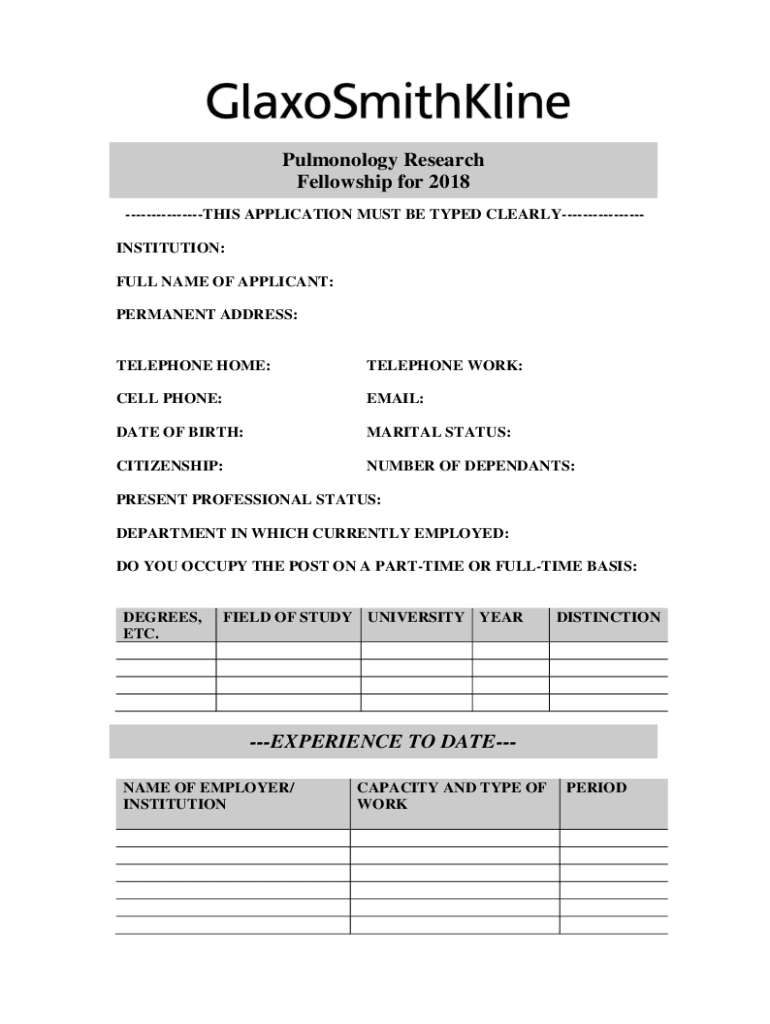 Pulmonology Research Fellowship for 2018 THIS APPLICATION MUST BE TYPED CLEARLYINSTITUTION: FULL NAME OF APPLICANT: PERMANENT ADDRESS:TELEPHONE HOME:TELEPHONE WORK:CELL PHONE:EMAIL:DATE OF BIRTH:MARITAL
