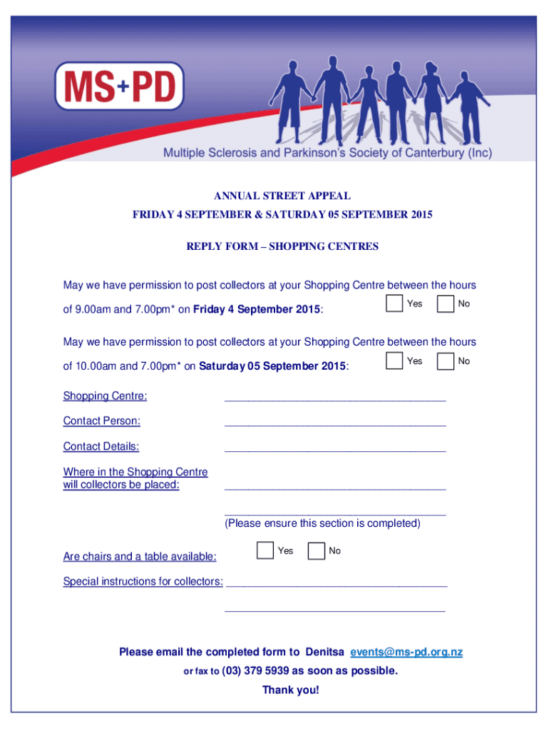 ANNUAL STREET APPEAL FRIDAY 4 SEPTEMBER & SATURDAY 05 SEPTEMBER 2015 REPLY FORM SHOPPING Centrism we have permission to post collectors at your Shopping Center between the hours Yes of 9.00am and