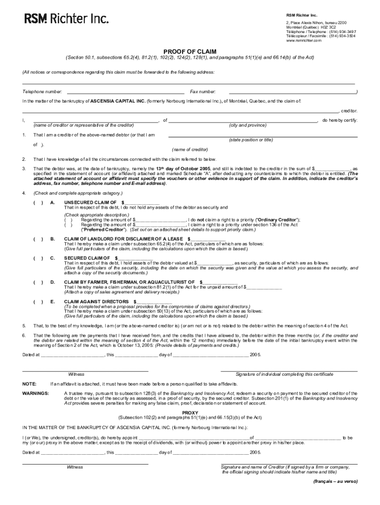 RSM Richter Inc. 2, Place Alexis Nixon, bureau 2200 Montreal (Quebec) H3Z 3C2 Tl phone / Telephone : (514) 9343497 Copier / Facsimile : (514) 9343504 www.rsmrichter.comPROOF OF CLAIM(Section 50.1,