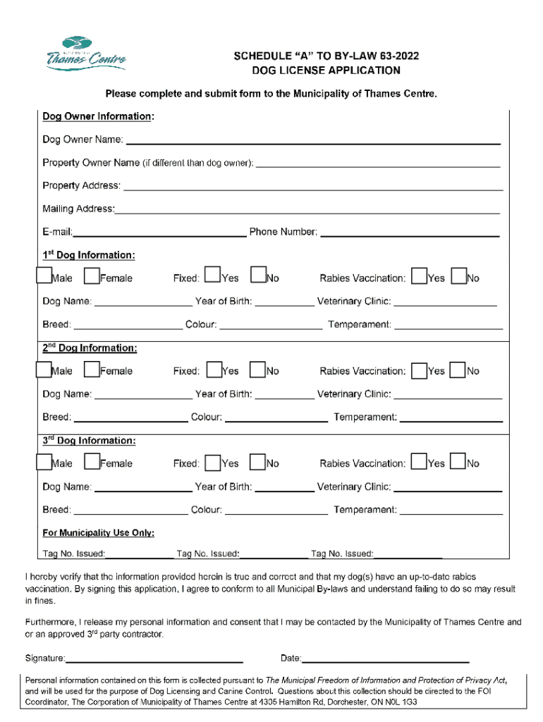 SCHEDULE \” A\” TO BYLAW 632022 DOG LICENSE APPLICATION 1. All dogs shall be registered pursuant to the requirements of the Animal Control Bylaw. 2. A maximum of 3 dogs are permitted for each