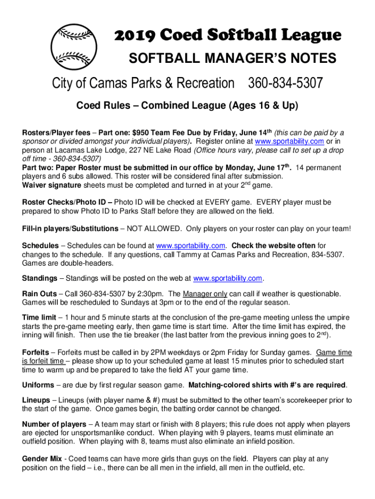 2019 Coed Softball League SOFTBALL MANAGERS Necessity of Camps Parks & Recreation 3608345307 Coed Rules Combined League (Ages 16 & Up) Rosters/Player fees Part one: $950 Team Fee Due by Friday, June