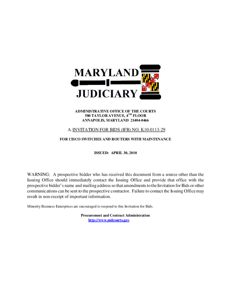 ADMINISTRATIVE OFFICE OF THE COURTS 580 TAYLOR AVENUE, 4TH FLOOR ANNAPOLIS, MARYLAND 214040466A. INVITATION FOR BIDS (IF) NO. K10011329 FOR CISCO SWITCHES AND ROUTERS WITH MAINTENANCEISSUED: APRIL