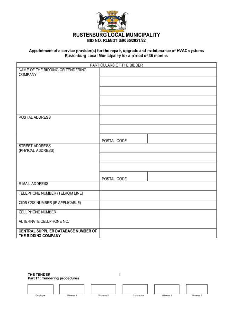 ROSENBERG LOCAL MUNICIPALITY BID NO: RIM/OTIS/0065/2021/22 Appointment of a service provider(s) for the repair, upgrade and maintenance of HVAC systems Rosenberg Local Municipality for a period of
