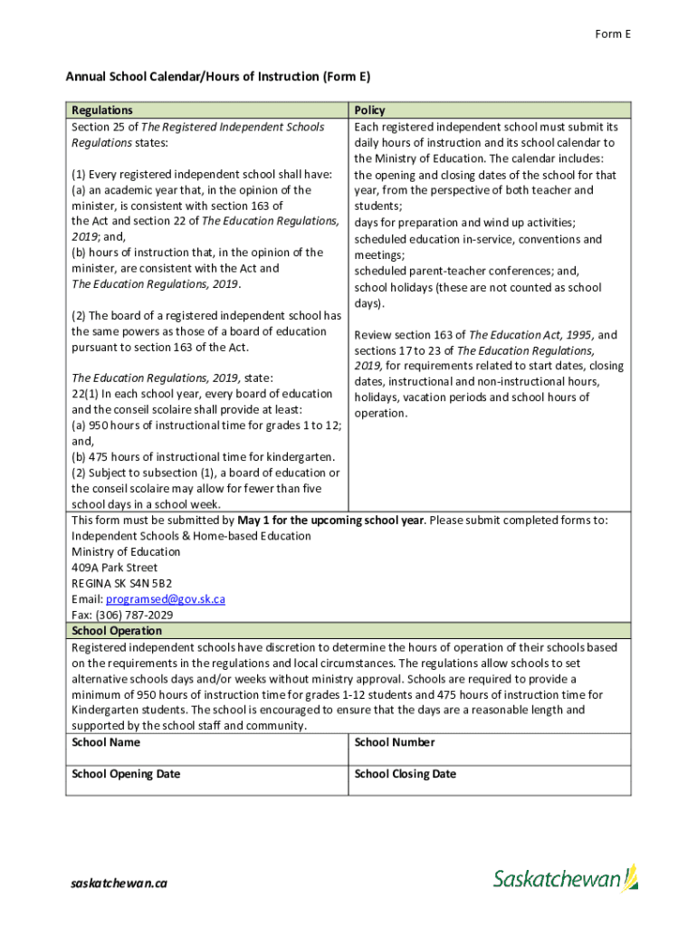 Form Annual School Calendar/Hours of Instruction (Form E) Regulations Section 25 of The Registered Independent Schools Regulations states: (1) Every registered independent school shall have: (a) an