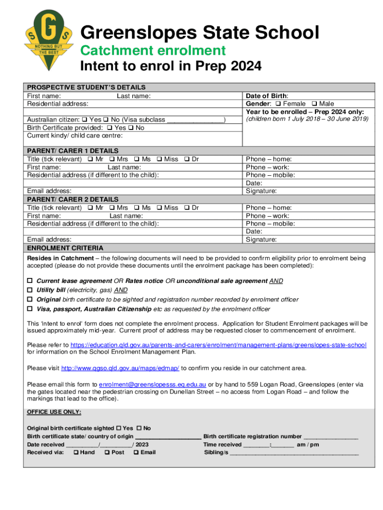 Green slopes State School Catchment enrollment Intent to enrol in Prep 2024 PROSPECTIVE STUDENTS DETAILS First name: Last name: Residential address: Australian citizen: Yes No (Visa subclass ___)