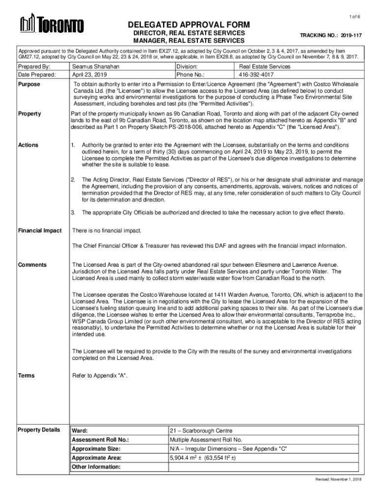 1 of 6DELEGATED APPROVAL FORM DIRECTOR, REAL ESTATE SERVICES MANAGER, REAL ESTATE SERVICESTRACKING NO.: 2019117Approved pursuant to the Delegated Authority contained in Item EX27.12, as adopted by