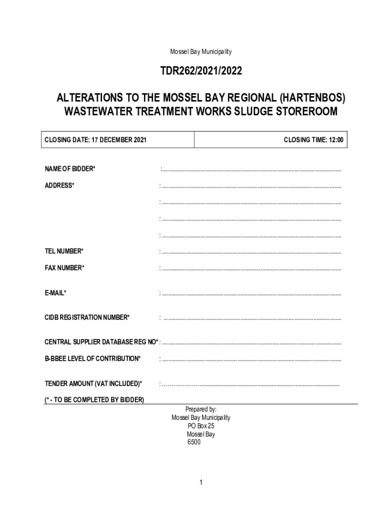 CLOSING DATE: 17 DECEMBER 2021CLOSING TIME: 12:00NAME OF BIDDER*:..........................................................................................................................ADDRESS*: