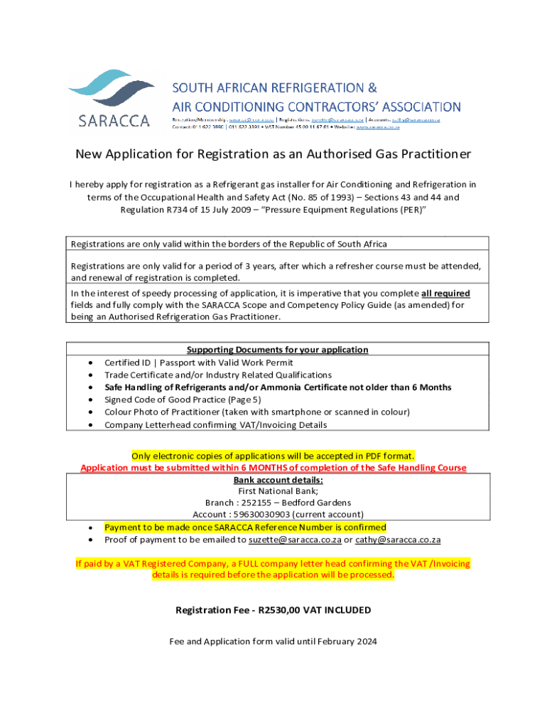 New Application for Registration as an Authorized Gas Practitioner I hereby apply for registration as a Refrigerant gas installer for Air Conditioning and Refrigeration in terms of the Occupational