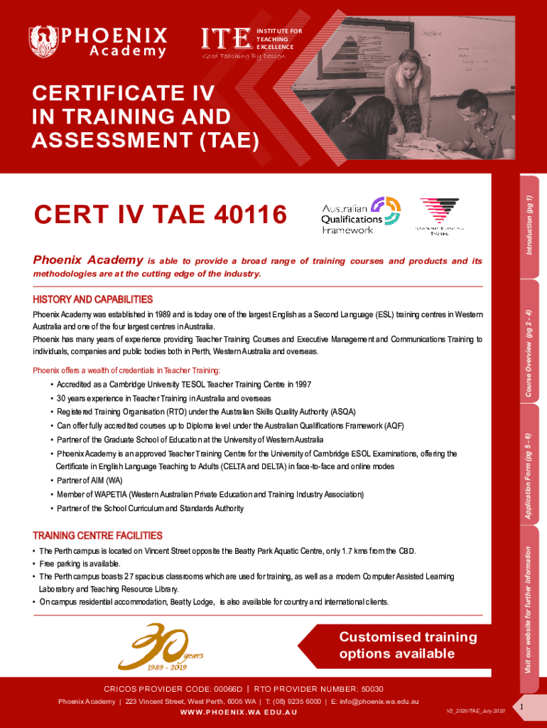 REINSTITUTE FOR TEACHING EXCELLENCE Good Teaching By DesignIntroduction (pg 1)CERTIFICATE IV IN TRAINING AND ASSESSMENT (TAE)CERT IV TAE 40116 Phoenix Academy is able to provide a broad range of training