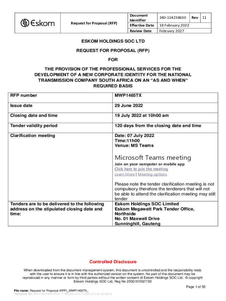 Request for Proposal (RFP)Document Identifier Effective Date Review Date240114238630Rev1118 February 2022 February 2027ESKOM HOLDINGS SOC LTD REQUEST FOR PROPOSAL (RFP) FOR THE PROVISION OF THE PROFESSIONAL