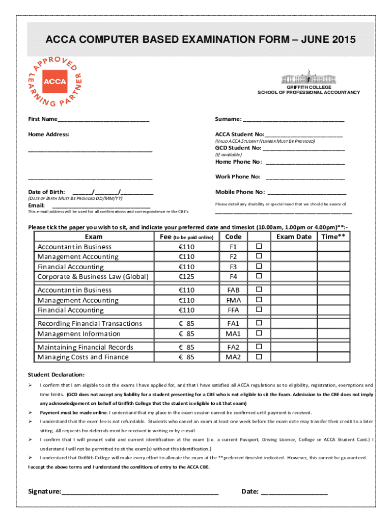 Get the free ACCA COMPUTER BASED EXAMINATION FORM JUNE 2015