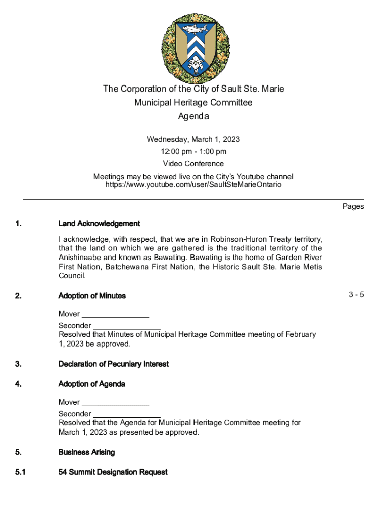 The Corporation of the City of Salt Ste. Marie Municipal Heritage Committee Agenda Wednesday, March 1, 2023 12:00 pm 1:00 pm Video Conference Meetings may be viewed live on the Cities YouTube channel