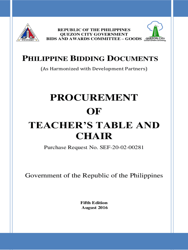 REPUBLIC OF THE PHILIPPINES QUEZON CITY GOVERNMENT BIDS AND AWARDS COMMITTEE GOODSPHILIPPINE BIDDING DOCUMENTS (As Harmonized with Development Partners)PROCUREMENT OF TEACHERS TABLE AND CHAIR Purchase