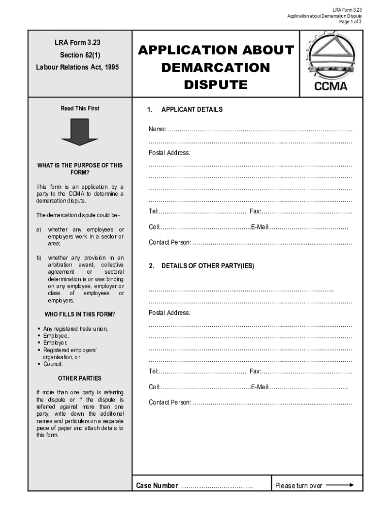 ERA Form 3.23 Application about Demarcation Dispute Page 1 of 3LRA Form 3.23 Section 62(1) Labor Relations Act, 1995Read This Misapplication ABOUT DEMARCATION DISPUTE 1.APPLICANT DETAILSName: ........