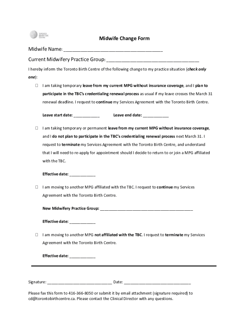 Midwife Change Form Midwife Name: ___ Current Midwifery Practice Group: ___ I hereby inform the Toronto Birth Center of the following change to my practice situation (check only one): I am taking