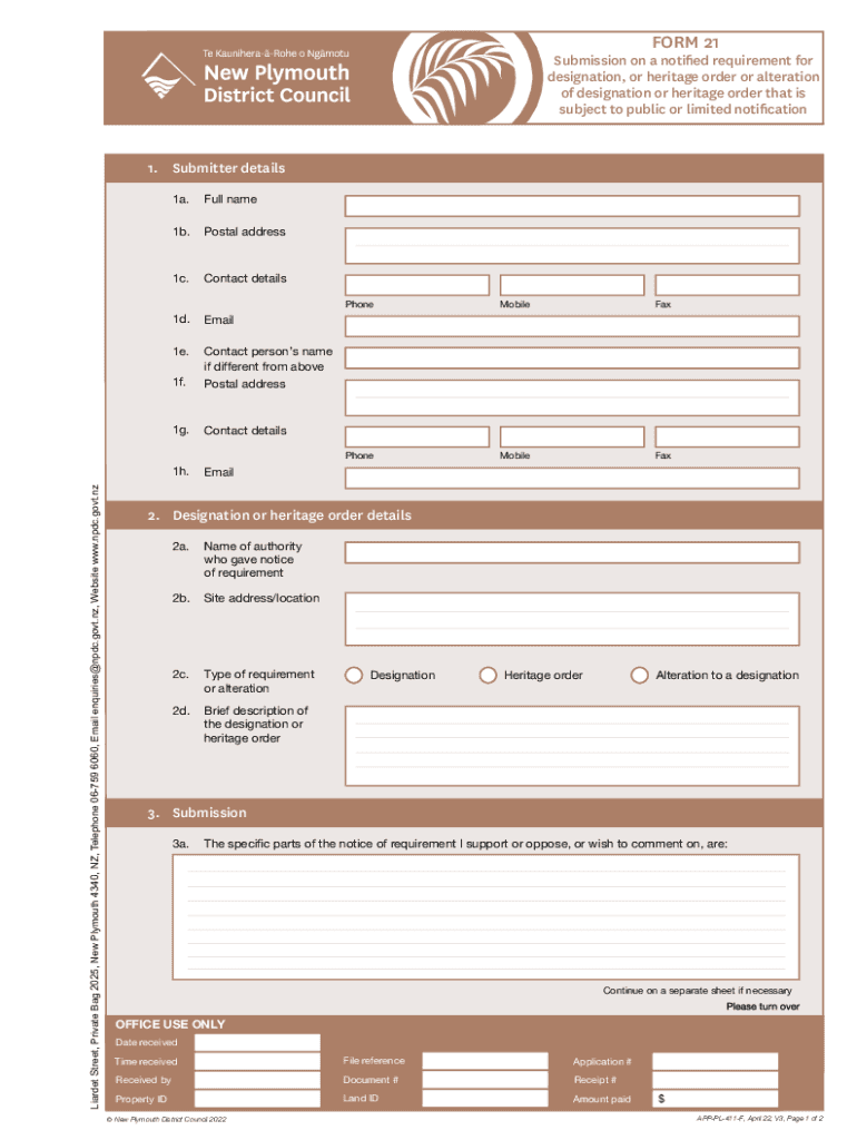 FORM 21Submission on a notified requirement for designation, or heritage order or alteration of designation or heritage order that is subject to public or limited notificationLiardet Street, Private