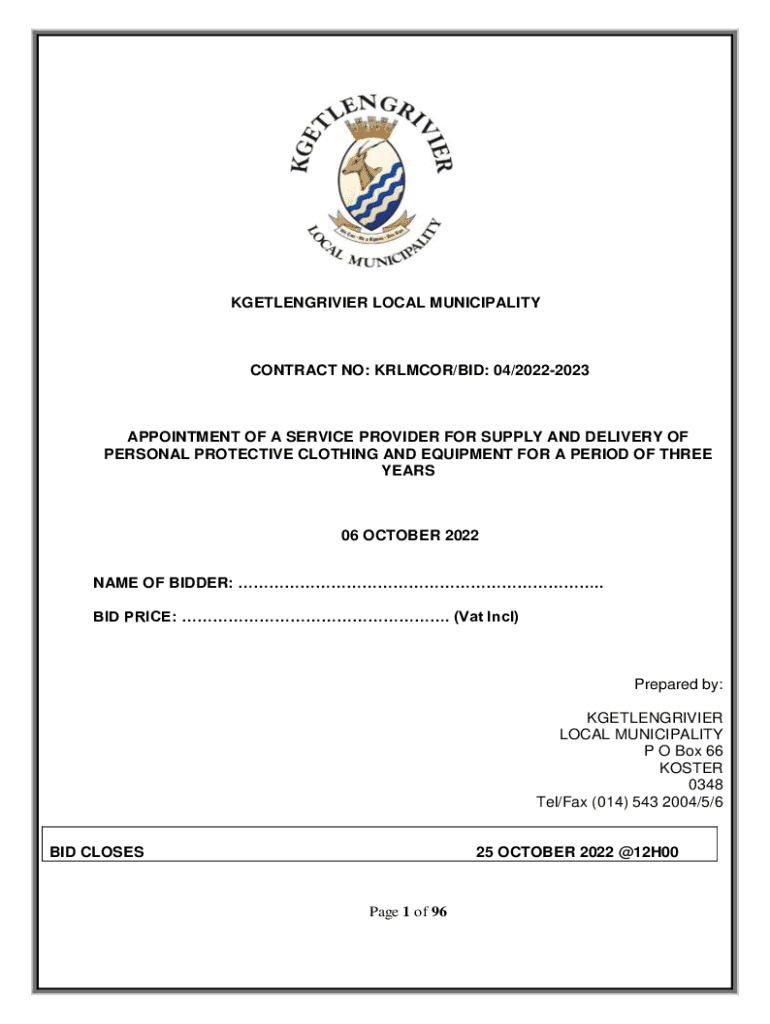 KGETLENGRIVIER LOCAL MUNICIPALITYCONTRACT NO: ARMOR/BID: 04/20222023APPOINTMENT OF A SERVICE PROVIDER FOR SUPPLY AND DELIVERY OF PERSONAL PROTECTIVE CLOTHING AND EQUIPMENT FOR A PERIOD OF THREE YEARS06