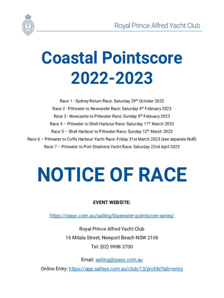 Royal Prince Alfred Yacht Subcostal Point score 20222023 Race 1 Sydney Return Race: Saturday 29th October 2022 Race 2 Pitt water to Newcastle Race: Saturday 4th February 2023 Race 3 Newcastle to Pitt