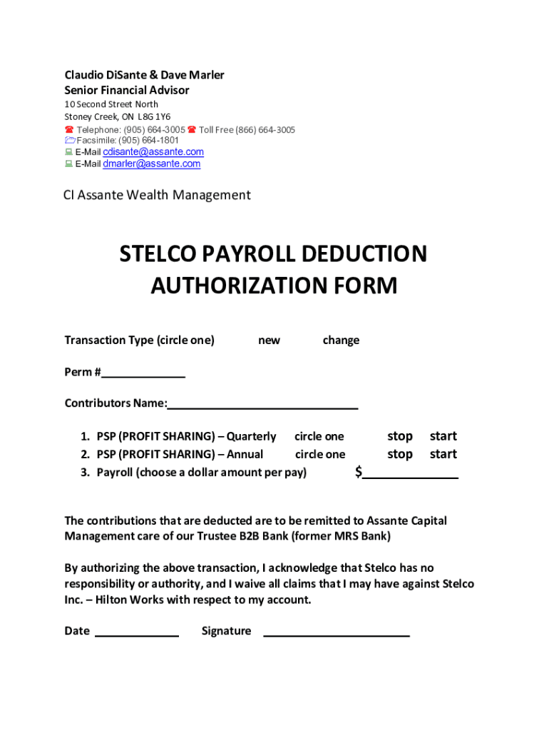 All Stelco employees who wish to have deductions taken from their paycheck are required to file a stelco payroll deduction form.