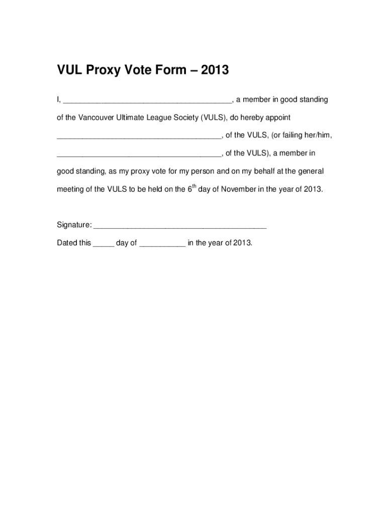 JUL Proxy Vote Form 2013 I, ___, a member in good standing of the Vancouver Ultimate League Society (VOLS), do hereby appoint ___, of the VOLS, (or failing her/him, ___, of the VOLS), a member in