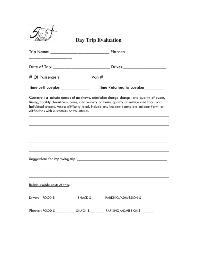 Day Trip Evaluation Trip Name: ___ Planner: ___ Date of Trip: ___ Driver:___ # Of Passengers:___ Van #___ Time Left Lepke:___Time Returned to Lepke:___Comments: Include names of no shows, admission
