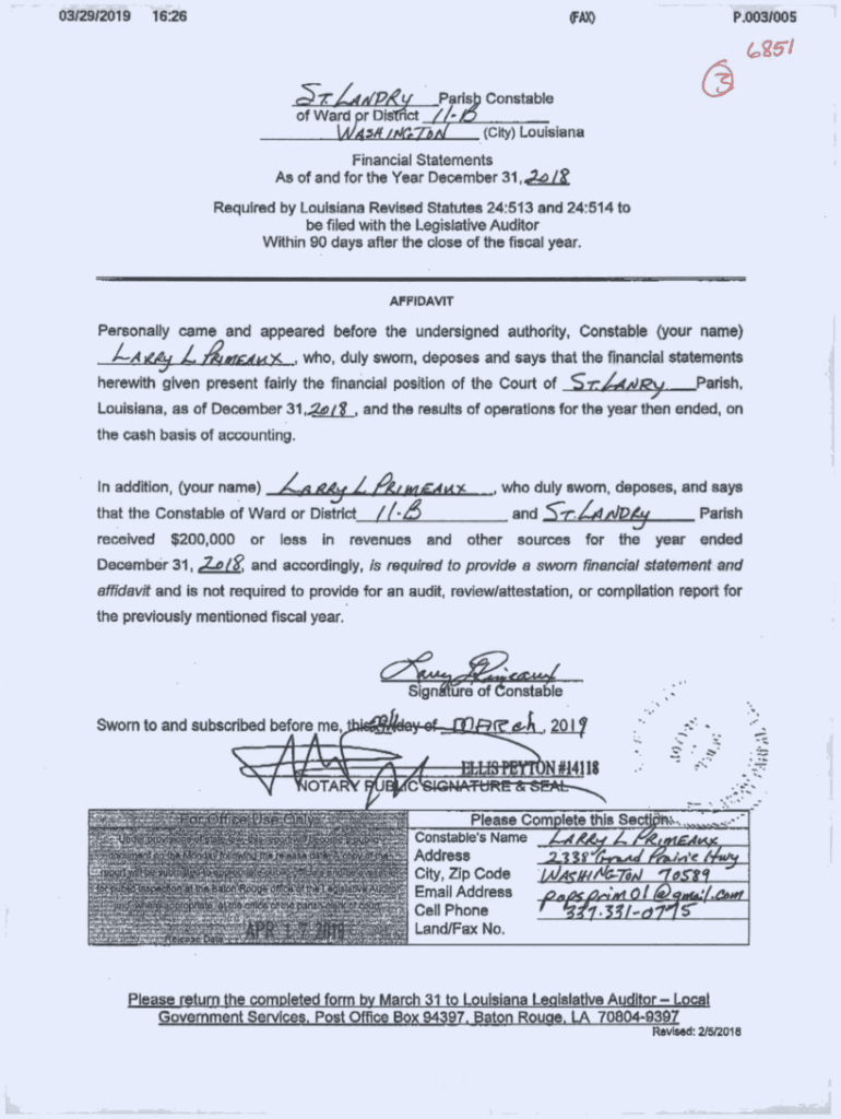 03/29/2019m1626P.003/005625/ Parish Constable of Ward pr District //(City) Louisiana WASKMm^l Financial Statements As of and for the Year December 31.^/? Required by Louisiana Revised Statutes 24:513