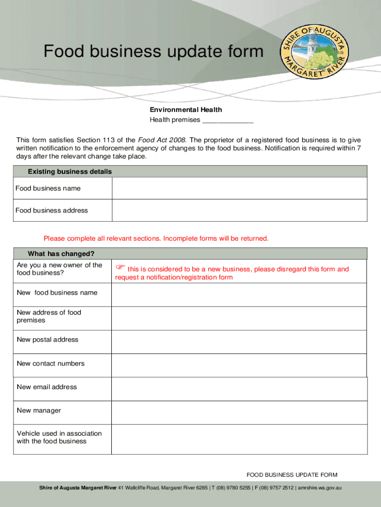 Food business update formEnvironmental Health, Health premises ___ This form satisfies Section 113 of the Food Act 2008. The proprietor of a registered food business is to give written notification