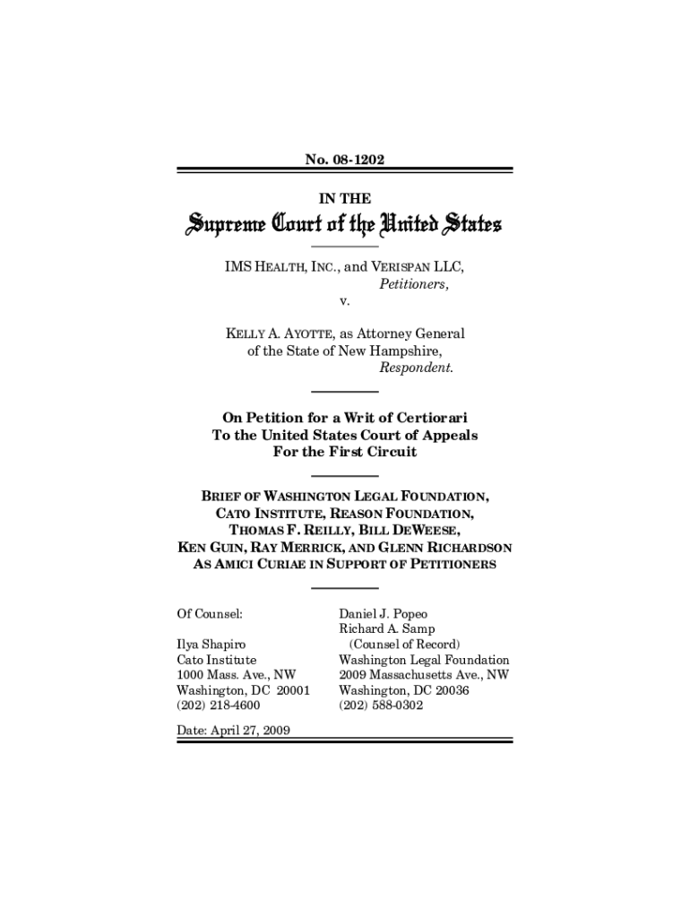 No. 081202 IN Supreme Court___ of the United States IMS HEALTH, INC., and VERSION LLC, Petitioners, v. KELLY A. AYOTTE, as Attorney General of the State of New Hampshire, Respondent. ___ On Petition