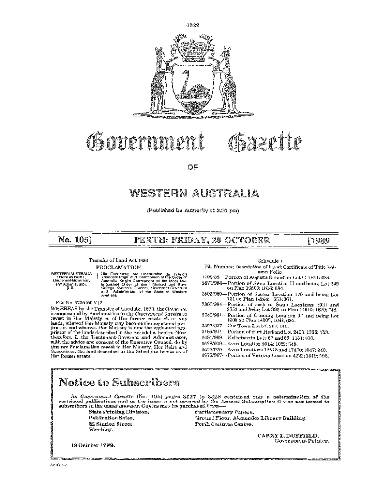 3829Izrunrnent WESTERN AUSTRALIA Published Authority at 3,30 Perth: FRIDAY, 20 October 105]Transfer of Land Act 1893 PROCLAMATION WESTERN AUSTRALIA FRANCIS BURT, Lieutenant Governor, and Administrator.