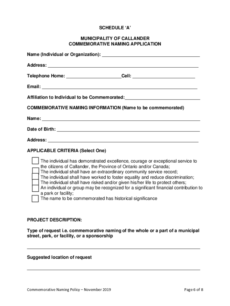 November 2019Municipality of Cal lander Commemorative Naming Policy PURPOSE This policy is to provide Council with structured guidelines and process in order to designate locations of commemorative