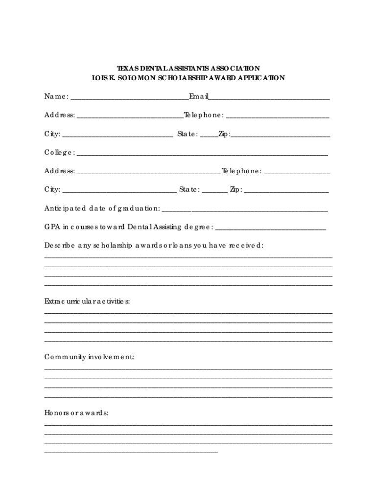 TEXAS DENTAL ASSISTANTS ASSOCIATION LOIS K. SOLOMON SCHOLARSHIP APPLICATIONSCHOLARSHIP INFORMATION The Texas Dental Assistants Association (DAA) will annually award scholarships in the amount of,
