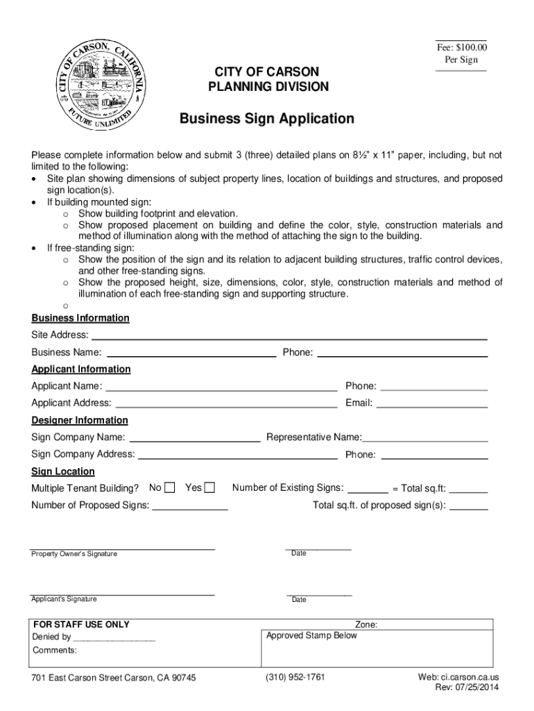 Fee: $100.00 Per Dignity OF CARSON PLANNING DIVISIONBusiness Sign Application Please complete information below and submit 3 (three) detailed plans on 8 × 11 paper, including, but not limited to