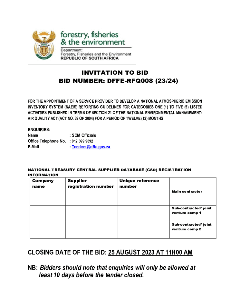 INVITATION TO BID NUMBER: DFFERFQ008 (23/24)FOR THE APPOINTMENT OF A SERVICE PROVIDER TO DEVELOP A NATIONAL ATMOSPHERIC EMISSION INVENTORY SYSTEM (NAZIS) REPORTING GUIDELINES FOR CATEGORIES ONE (1)
