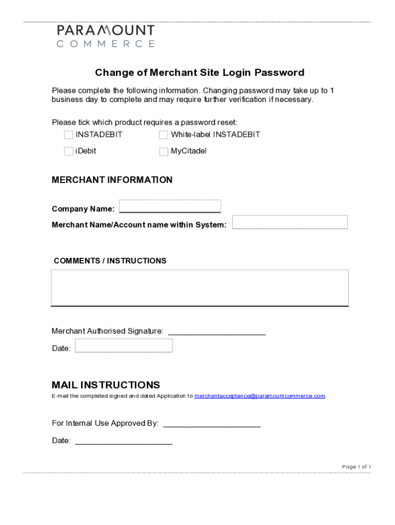Change of Merchant Site Login Password Please complete the following information. Changing password may take up to 1 business day to complete and may require further verification if necessary. Please