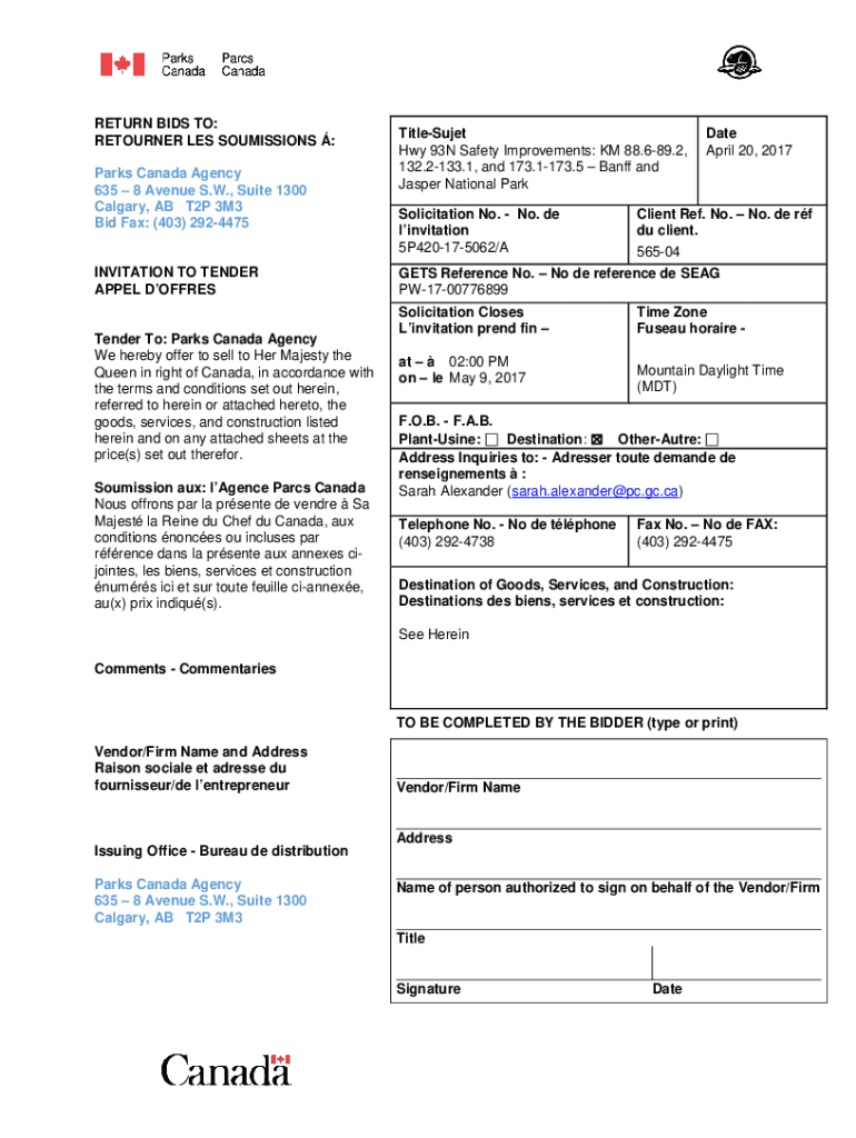 RETURN BIDS TO: RETURNER LES COMMISSIONS : Parks Canada Agency 635 8 Avenue S.W., Suite 1300 Calgary, AB T2P 3M3 Bid Fax: (403) 2924475INVITATION TO TENDER APPEAL DOFFRESTender To: Parks Canada Agency