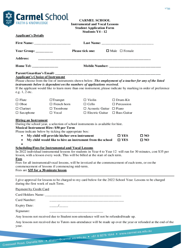 CARMEL SCHOOL Instrumental and Vocal Lessons Student Application Form Students Y4 12 Applicants Details First Name: ___ Year Group: ___ Address:Last Name: ___ Please tick one: Male Female___Home Tel: