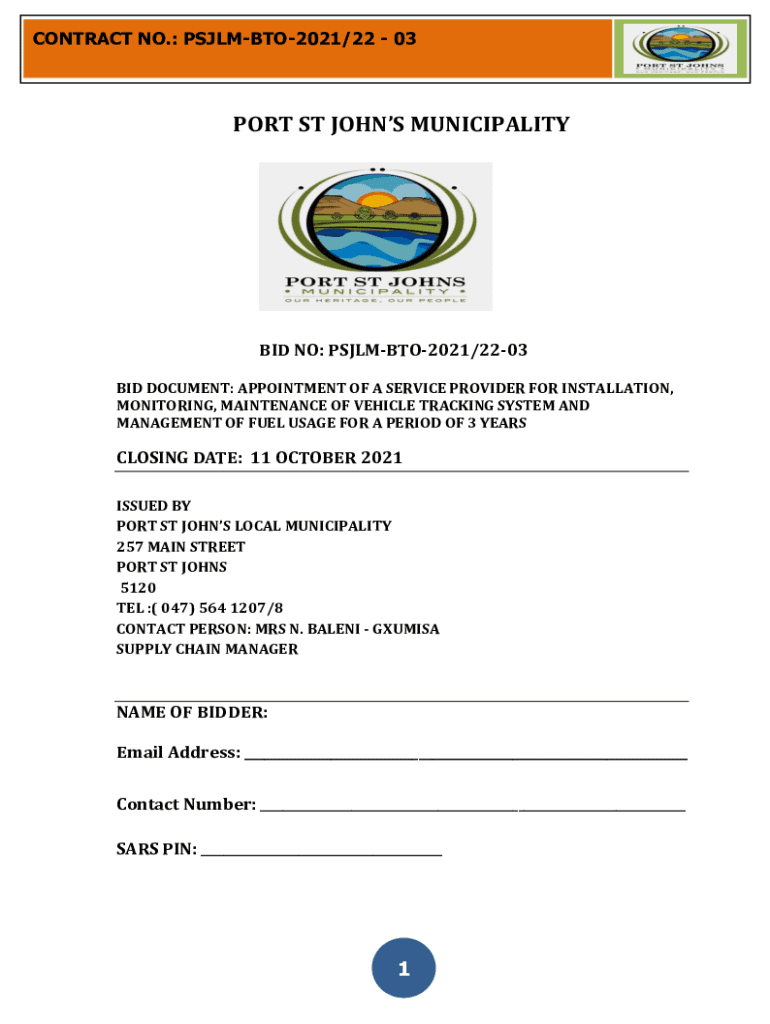 CONTRACT NO.: PSJLMBTO2021/22 03PORT ST JOHNS MUNICIPALITY BID NO: PSJLMBTO2021/2203 BID DOCUMENT: APPOINTMENT OF A SERVICE PROVIDER FOR INSTALLATION, MONITORING, MAINTENANCE OF VEHICLE TRACKING SYSTEM