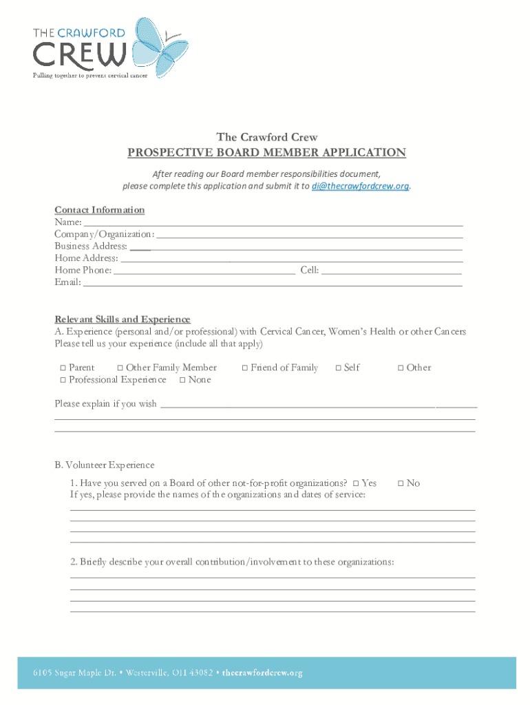 The Crawford Crew PROSPECTIVE BOARD MEMBER APPLICATION After reading our Board member responsibilities document, please complete this application and submit it to di@thecrawfordcrew.org. Contact Information