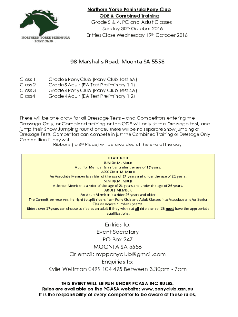 Northern Yoke Peninsula Pony Club ODE & Combined Training Grade 5 & 4, PC and Adult Classes Sunday 30th October 2016 Entries Close Wednesday 19th October 201698 Marshall's Road, Moon ta SA 5558 Class