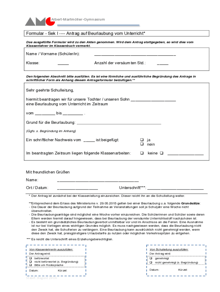 Holen Sie sich kostenlos Formular - Sek I ---- Antrag auf Beurlaubung vom Unterricht*