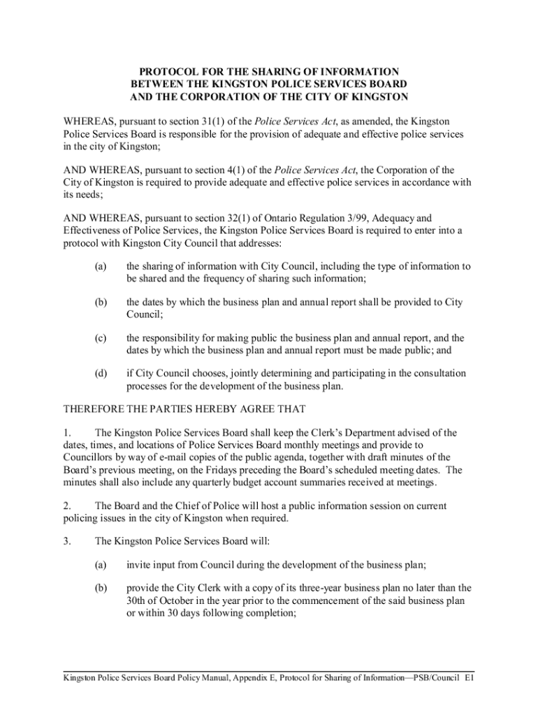 PROTOCOL FOR THE SHARING OF INFORMATION BETWEEN THE KINGSTON POLICE SERVICES BOARD AND THE CORPORATION OF THE CITY OF KINGSTON WHEREAS, pursuant to section 31(1) of the Police Services Act, as amended,