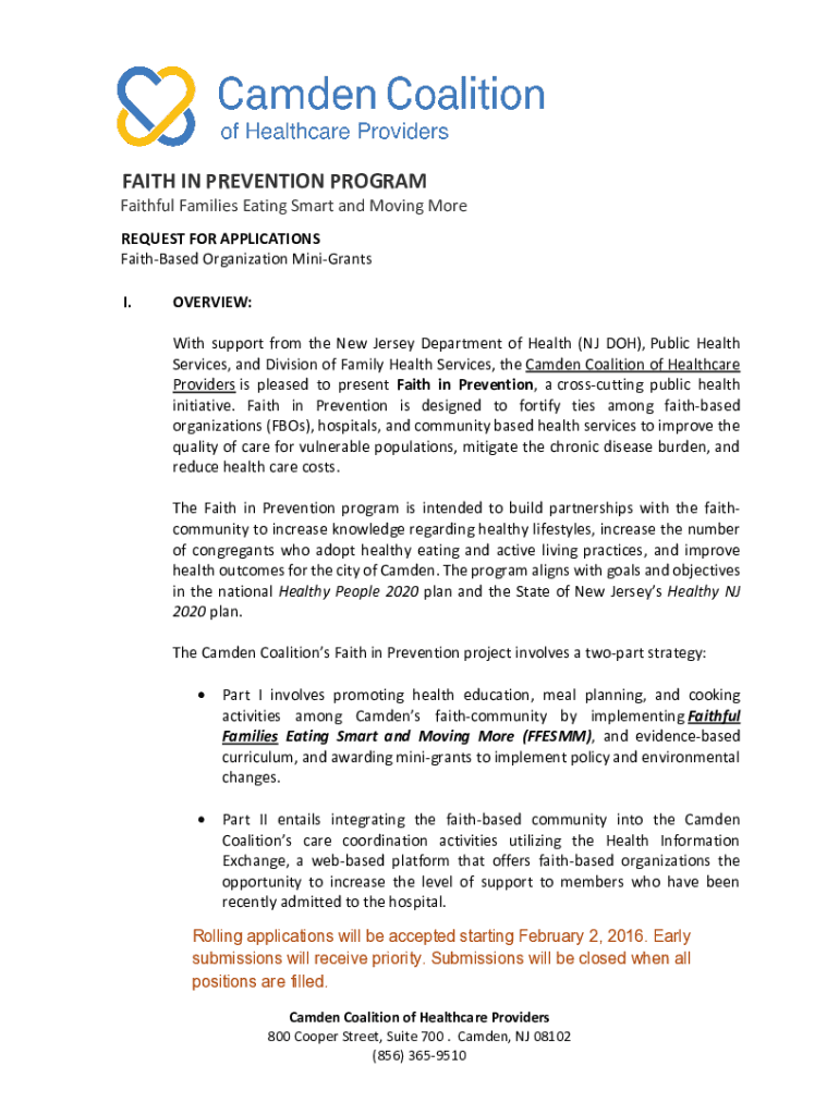 FAITH IN PREVENTION PROGRAM Faithful Families Eating Smart and Moving More REQUEST FOR APPLICATIONS Fatheaded Organization Migrants I.OVERVIEW: With support from the New Jersey Department of Health