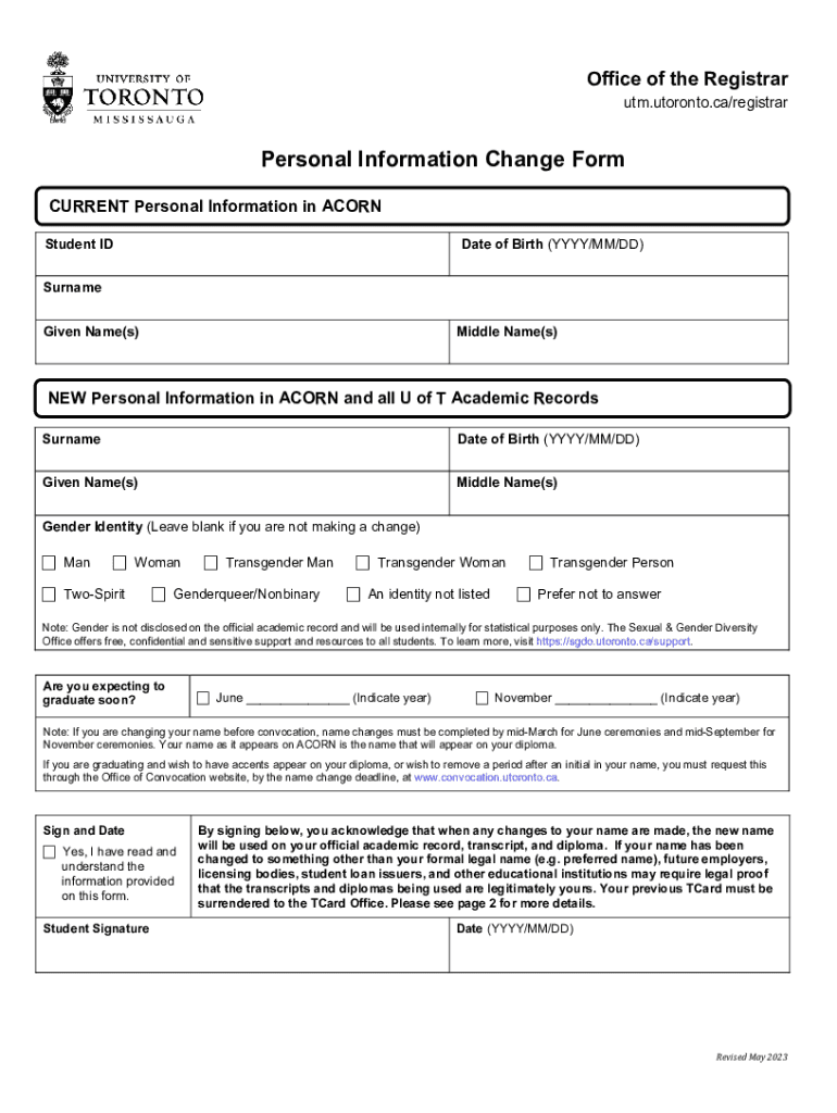 Office of the Registrarutm.utoronto.ca/registrarPersonal Information Change Form CURRENT Personal Information in ACORN Student IDATE of Birth (YYY/MM/DD)Surname Given Name(s)Middle Name(s)NEW Personal