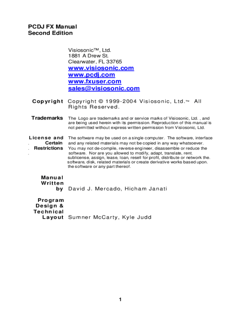 CDJ FX Manual Second Edition Isotonic, Ltd. 1881 A Drew St. Clearwater, FL 33765www.visiosonic.com www.pcdj.com www.fxuser.com sales@visiosonic.com C o p yr i g ht C op yr IG h t 199 92 00 4 Vi's