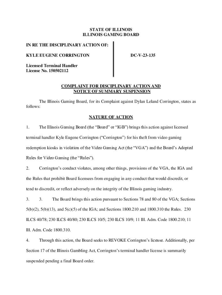STATE OF ILLINOIS GAMING BOARD IN RE THE DISCIPLINARY ACTION OF: KYLE EUGENE CORRINGTONDCV23135Licensed Terminal Handler License No. 150502112COMPLAINT FOR DISCIPLINARY ACTION AND NOTICE OF SUMMARY