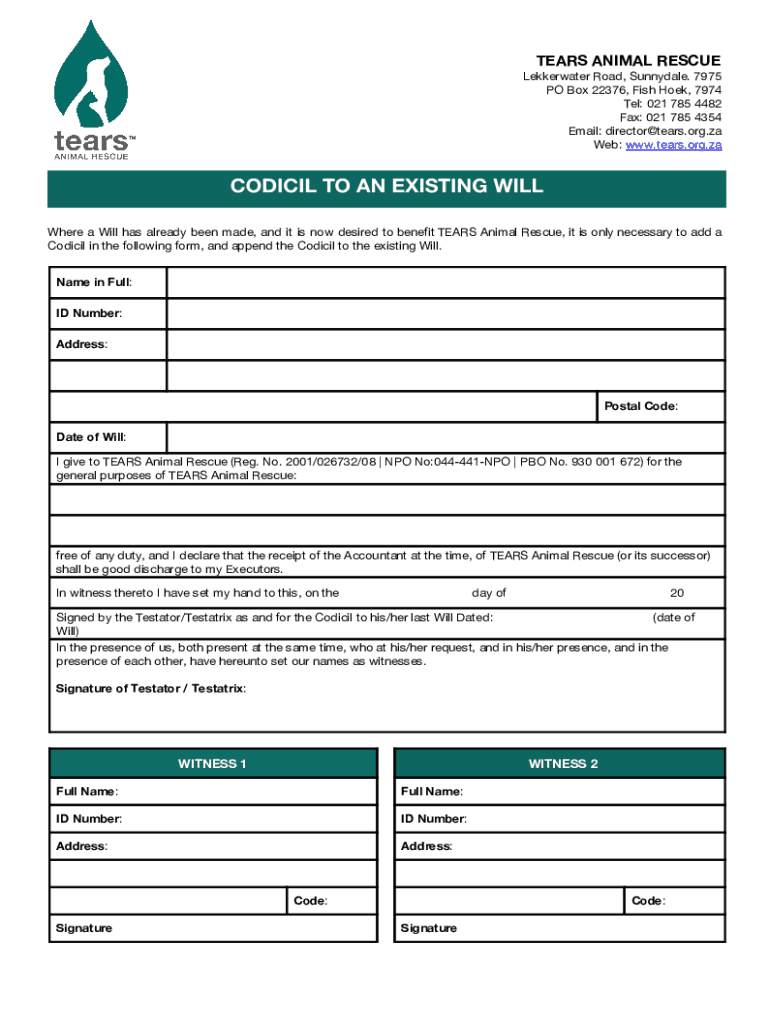 TEARS ANIMAL RESCUELekkerwater Road, Sunnyvale. 7975 PO Box 22376, Fish Hook, 7974 Tells: 021 785 4482 Fax: 021 785 4354 Email: director@tears.org.za Web: www.tears.org.zaWhere a Will has already
